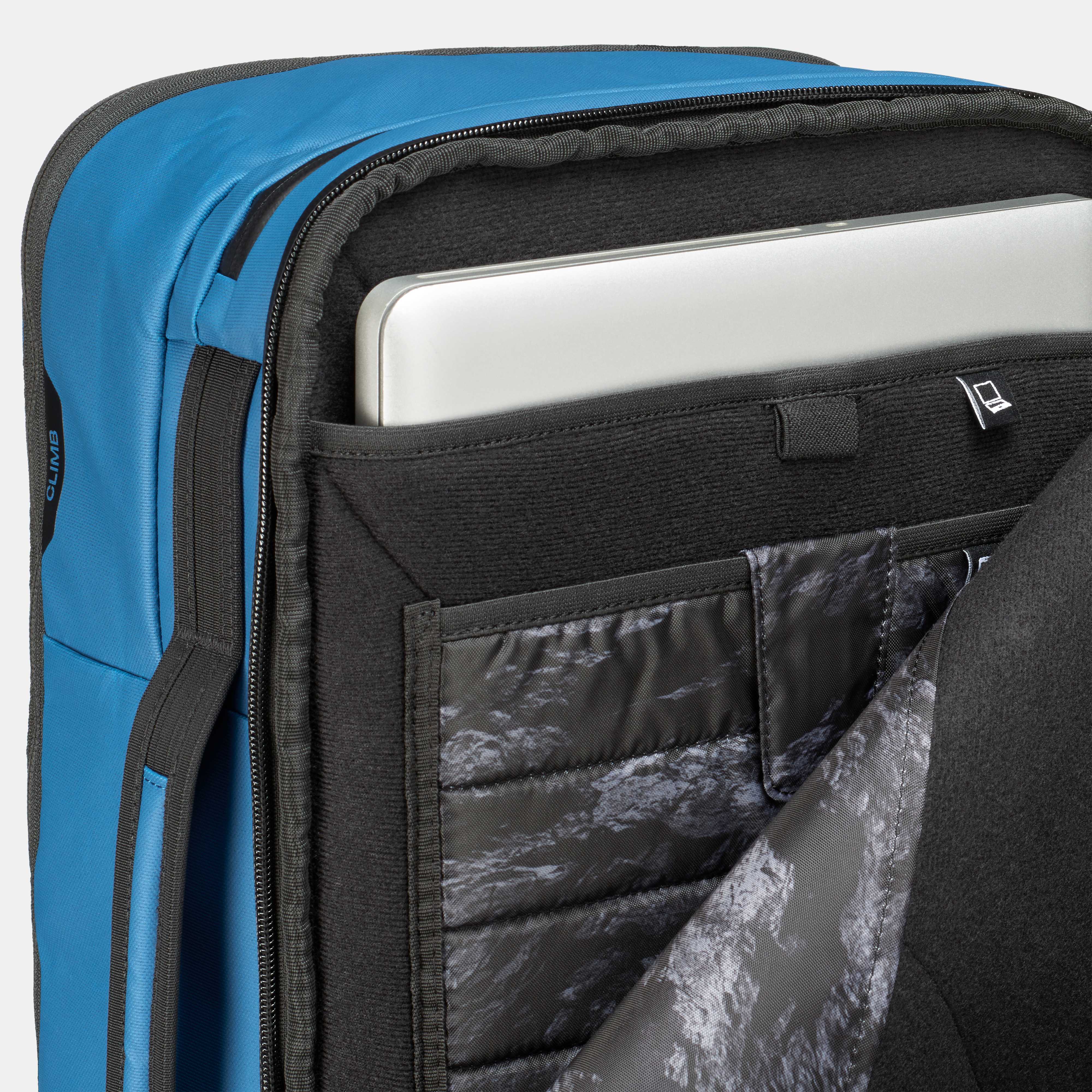 • Water-repellent padded secondary "WORK" compartment, accessible from the outside - ideal for carrying a laptop, tablet and documents